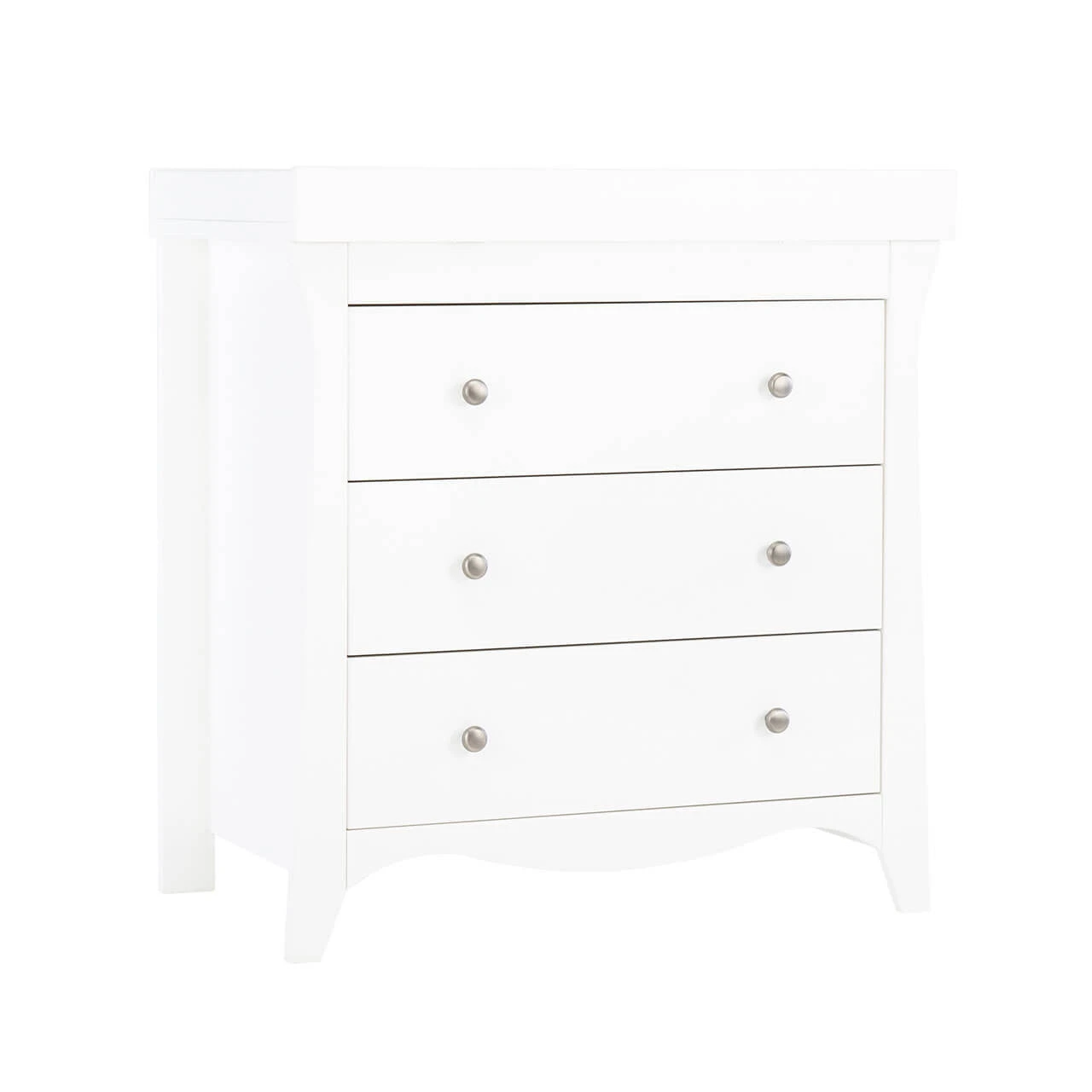 The CuddleCo Clara Dresser is a piece of fashionable and practical furniture to complete your fairy tale nursery. This stylish dresser features 3 spacious drawers, which can be arranged to store your baby clothes and nappy changing essentials. Classic curved shapes and modern brushed metal handles add this dresser an extraordinary contrasting appearance. It comes with a solidly made detachable changing station on top and wall strap kit for additional stability and safety. This furniture is carefully designed in Great Britain and made of solid pine and manufactured wood.