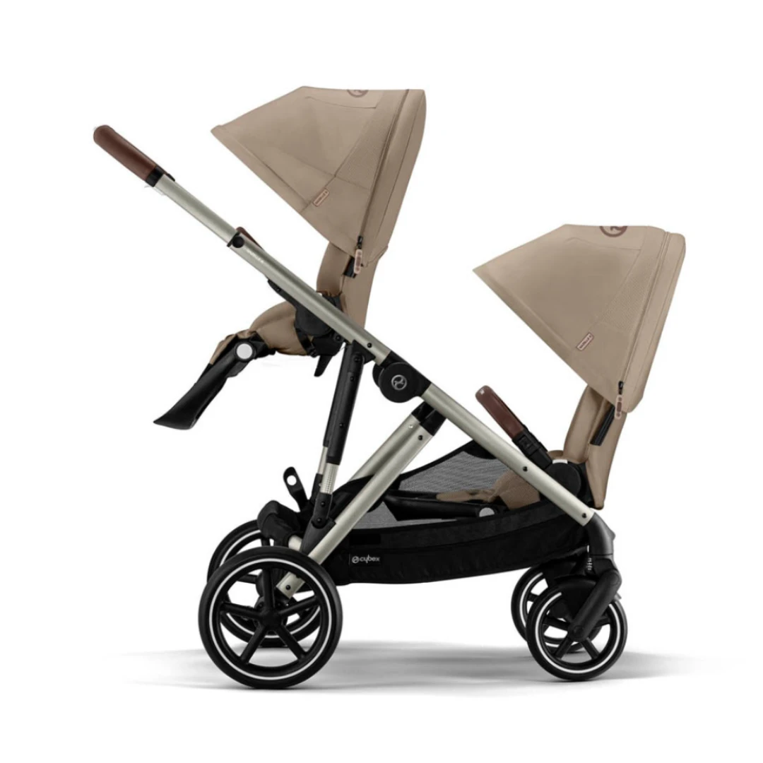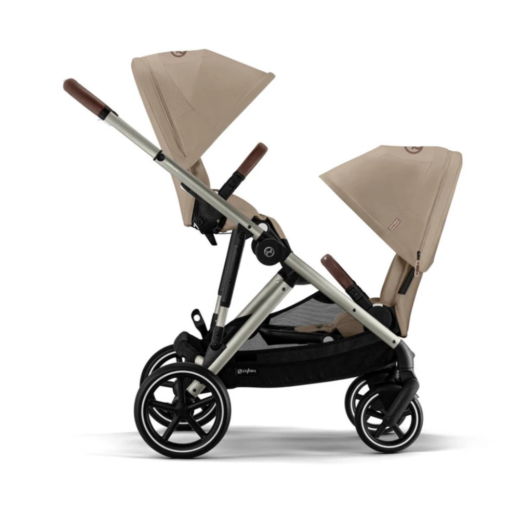 The stylish and adaptable Cybex eGazelle S Double in Almond Beige is the perfect travel solution for your growing family and now boasts a one-pull harness and upgraded recline functionality.