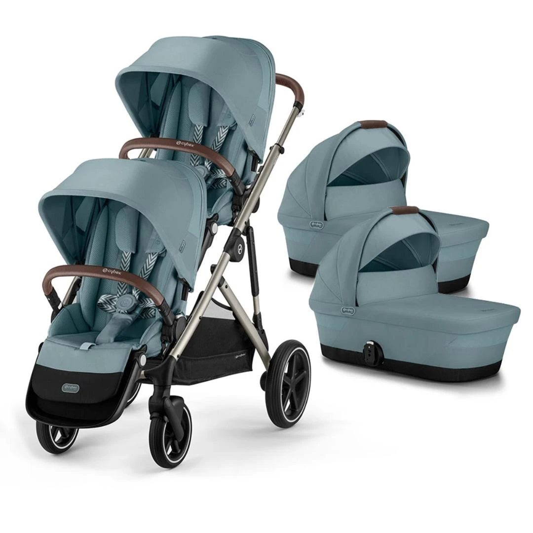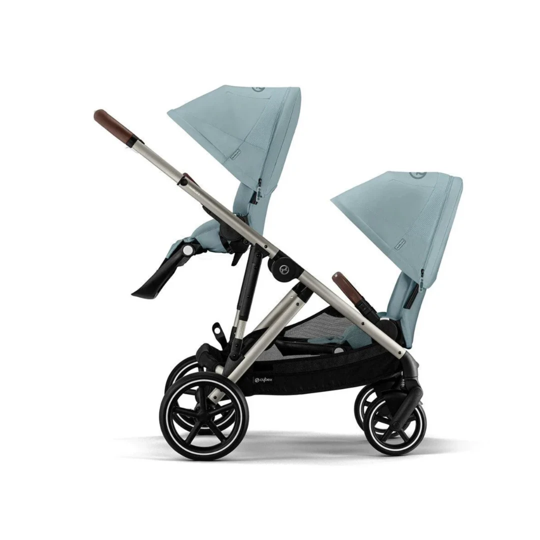 The stylish and adaptable Cybex Gazelle S Twin Pushchair in Stormy Blue on a taupe frame is the perfect travel solution for your growing family and now boasts a one-pull harness and upgraded recline functionality.