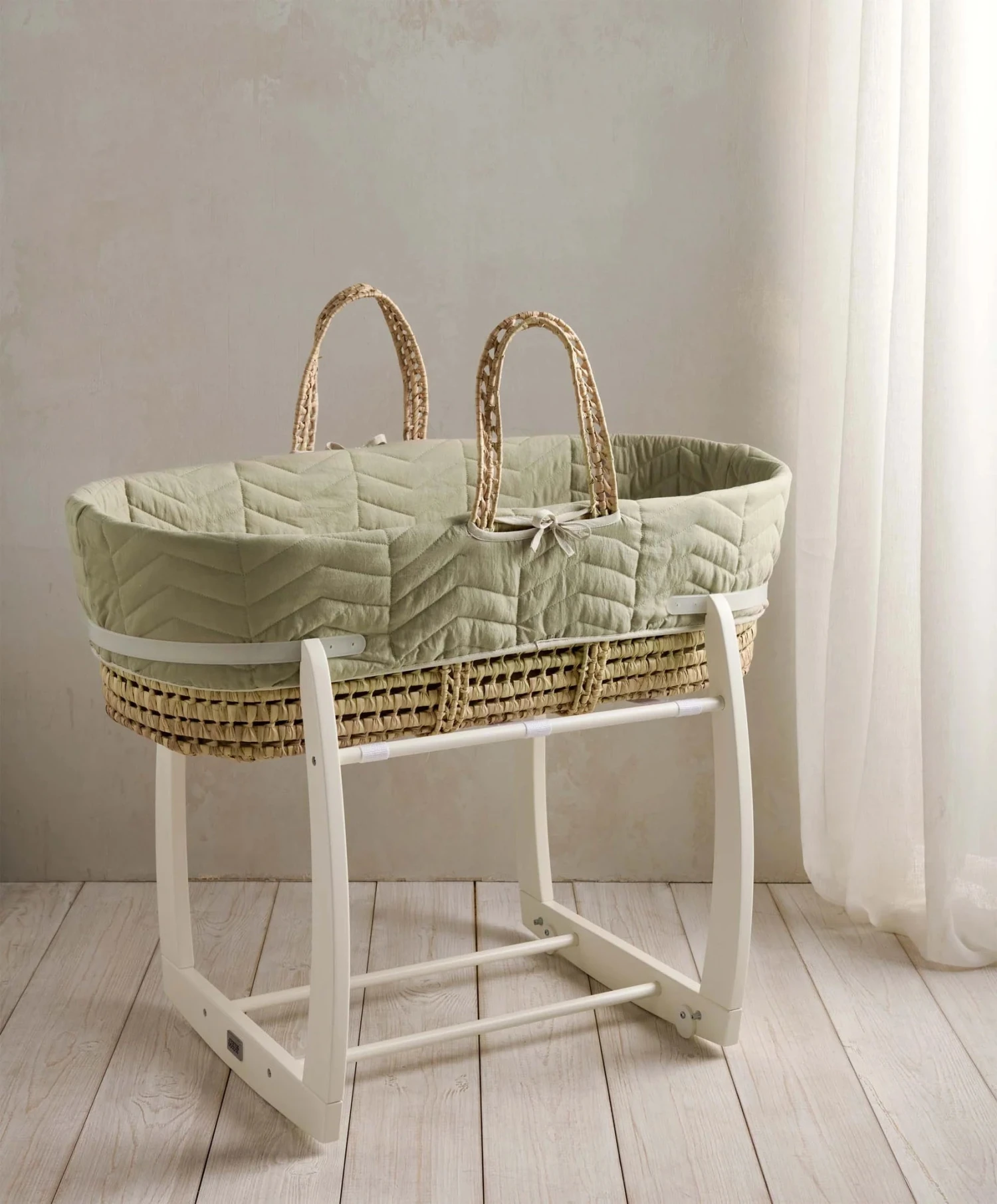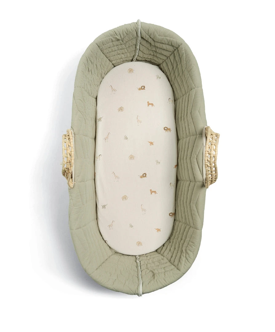 Natural Palm woven Moses Basket lined with a sage quilted liner – which co-ordinates perfectly with other quilted elements of the Born to be Wild collection. Moses Basket Sheet included, featuring a safari themed print.