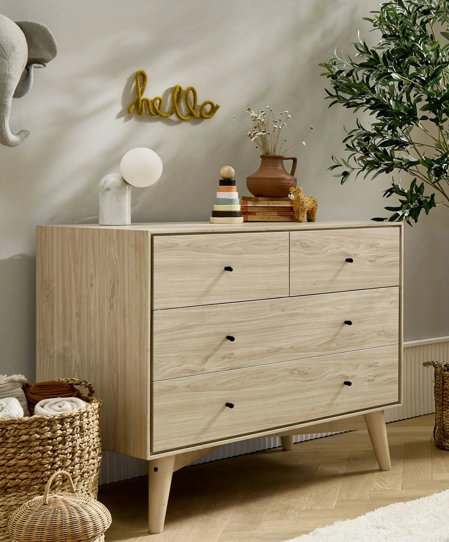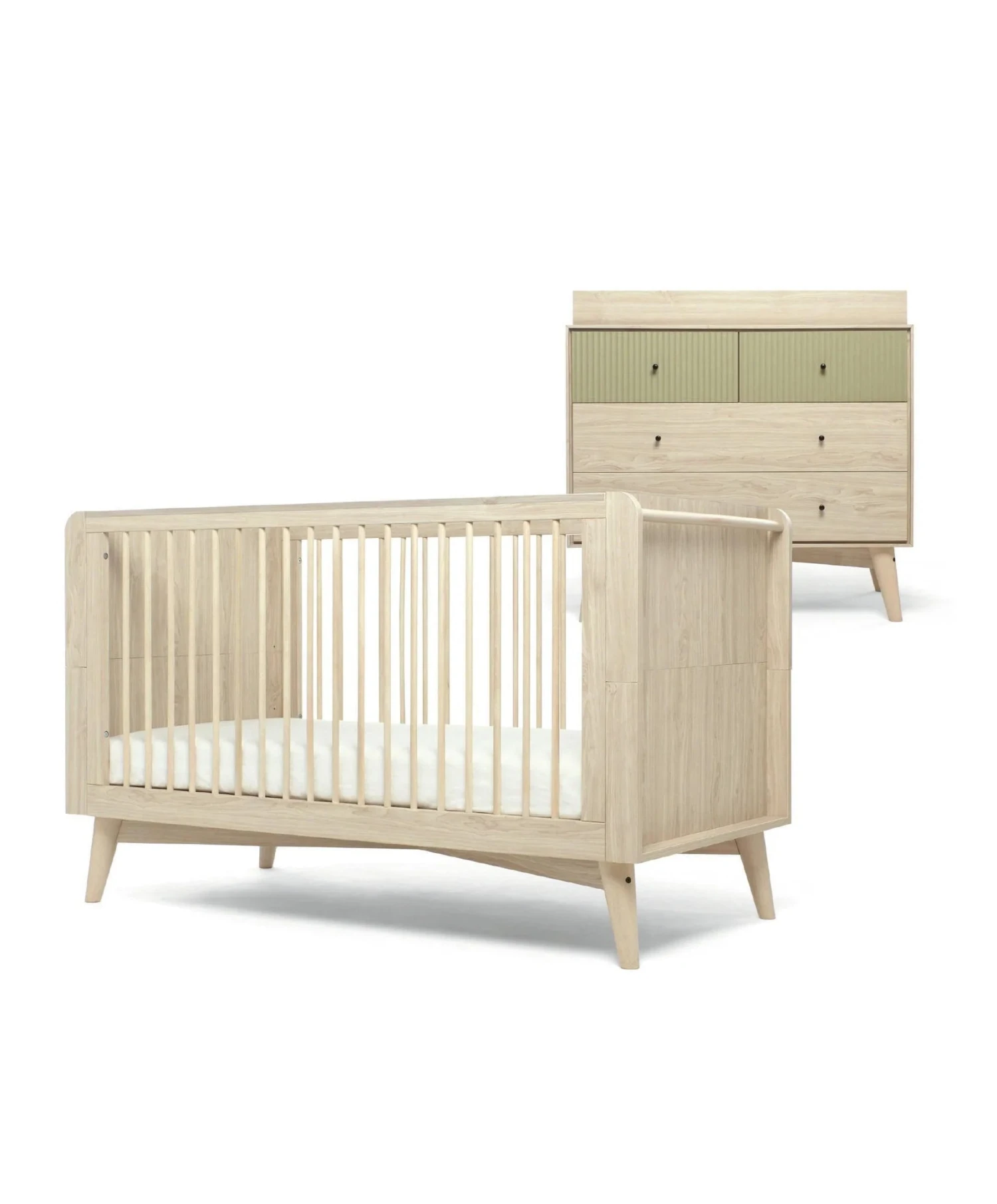 Our Coxley 2-piece nursery set comes with a stylish cotbed and multi-purpose dresser. The cot comes with three adjustable height positions and converts into toddler bed, meaning it’s sure to see you through the first four years. The dresser comes with a removable changing top which takes the dresser from a handy baby changing unit to a sleek dresser that can be dressed with all your toddler’s favourite toys and keepsakes. The flexibility to change the colour of the drawer fronts on the dresser allows you to customize to suit your style of nursery, adding to the longevity of this range, way beyond those nursery years.