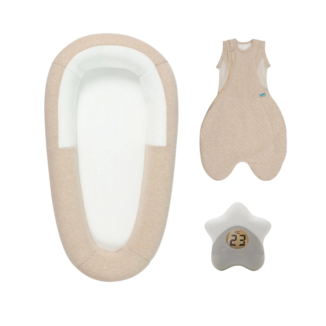 The Purflo Sleep Starter Bundle in Hazel is perfect for ensuring your little one is kept snug, safe and secure when drifting off to the land of nod, and includes the award-winning Sleep Tight baby bed, Swaddle To Sleep Bag 2.5 TOG and Starlight Colour-Changing Room Thermometer.