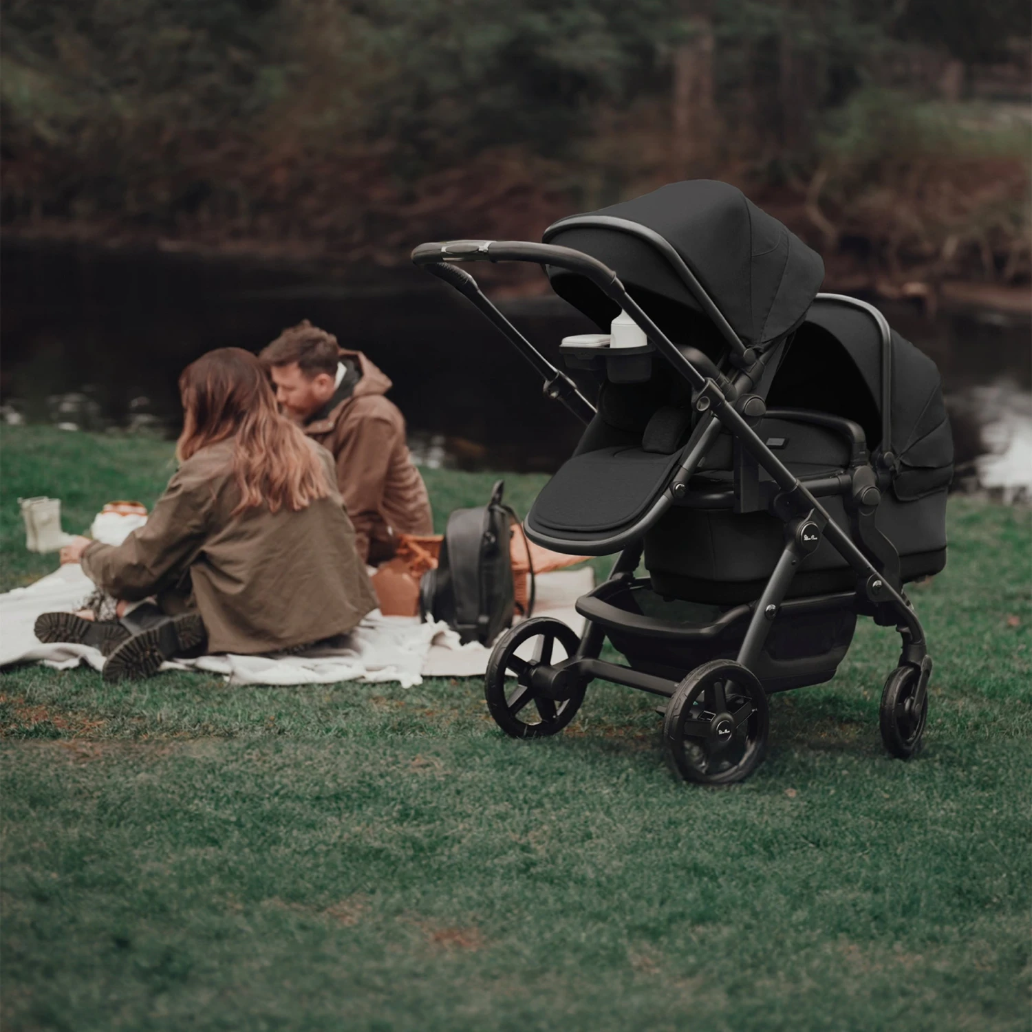 The Twin Bundle includes all the accessories you need for twins – two carrycots, two Dream i-Size infant carriers, bases and adaptors, two footmuffs, a stylish changing bag, phone holder, cup holder, snack tray and carrycot adaptors.