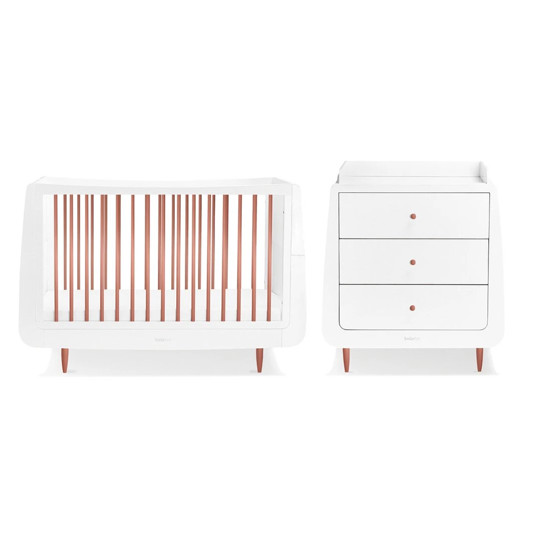 Part of the SnüzKot Collection, this new Snüzkot Metallic 2 Piece Furniture Set – Rose Gold On White helps you create a truly unique nursery tailored to your style.