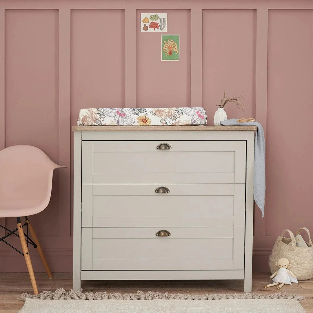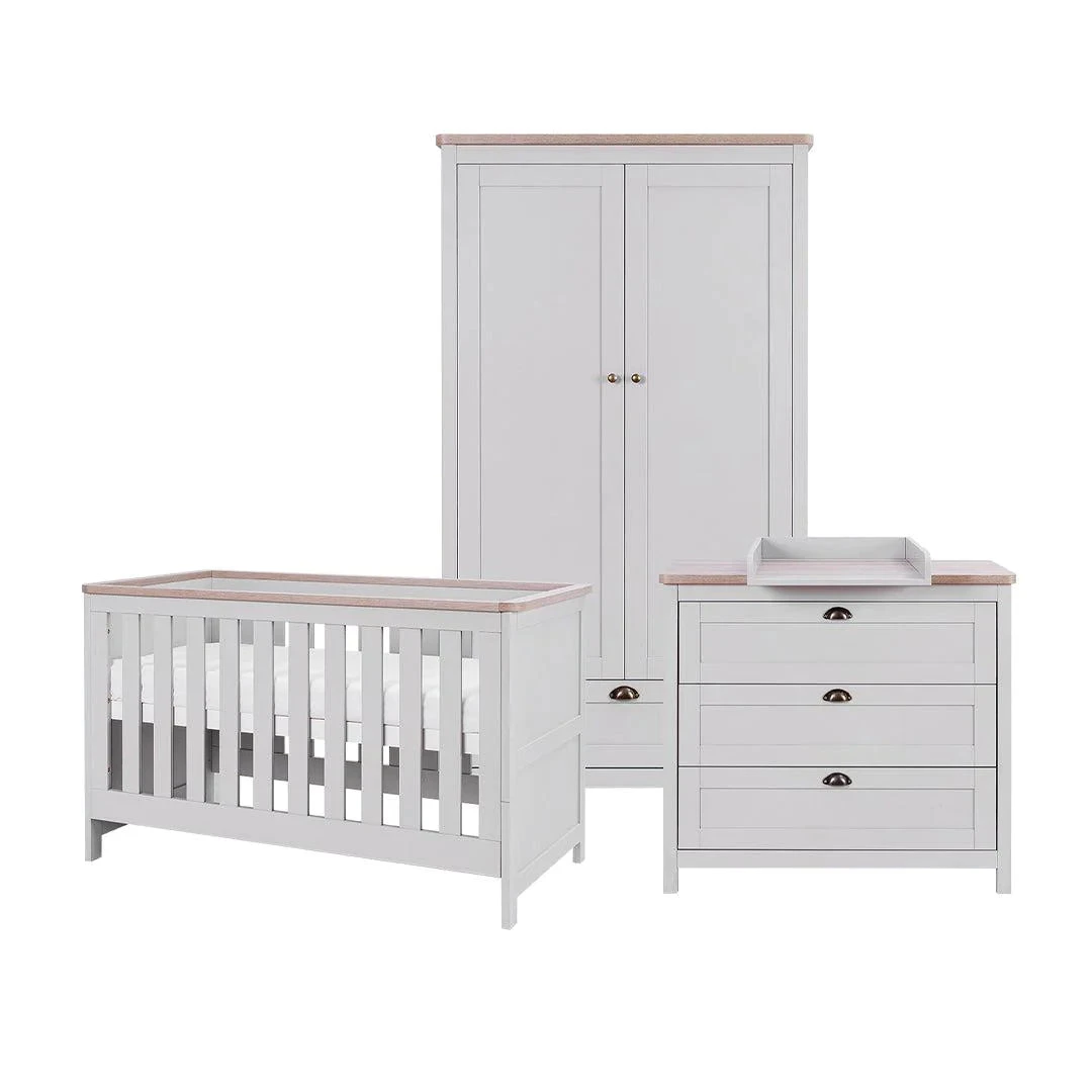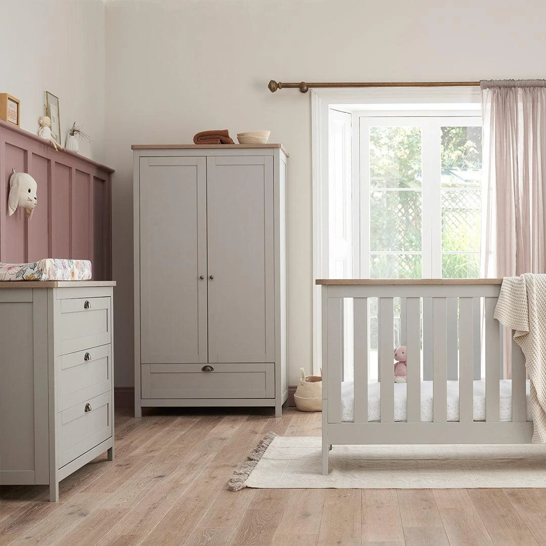 The Tutti Bambini Verona 3 Piece Room Set in Dove Grey/Oak is designed with clean lines and finished in classic dove grey and oak, the Verona two-piece nursery furniture set promises a beautiful traditional look for your nursery. This shaker-style furniture set consists of a full-sized cot bed, chest changer and wardrobe giving you ample storage for your growing family.
